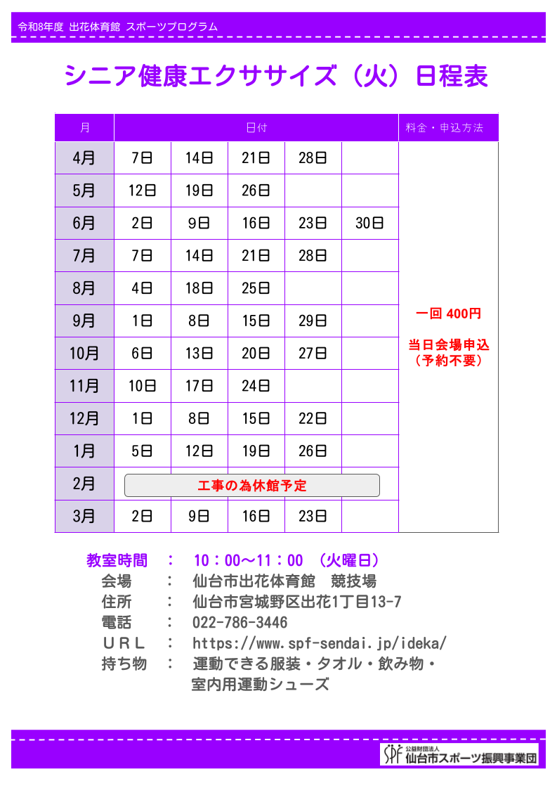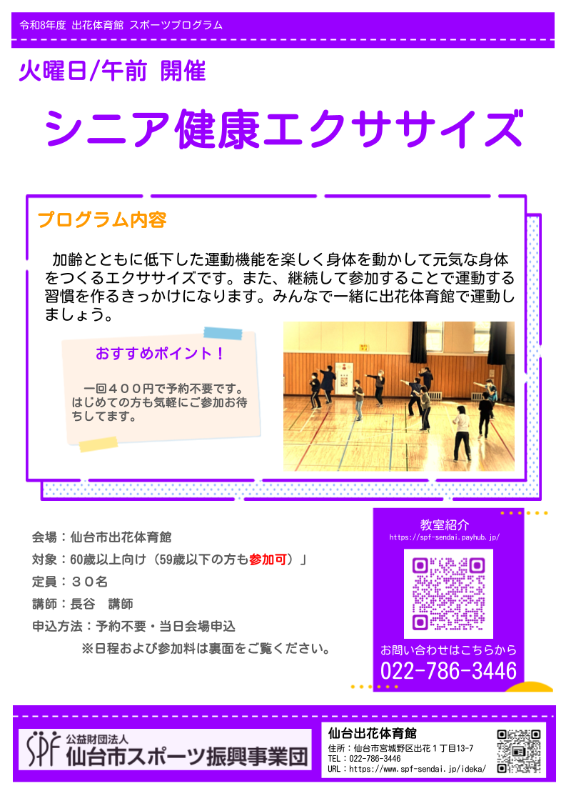 | お問い合わせ | 仙台市出花体育館 住所 仙台市出花1丁目-13-7 TEL:022-786-3446 |