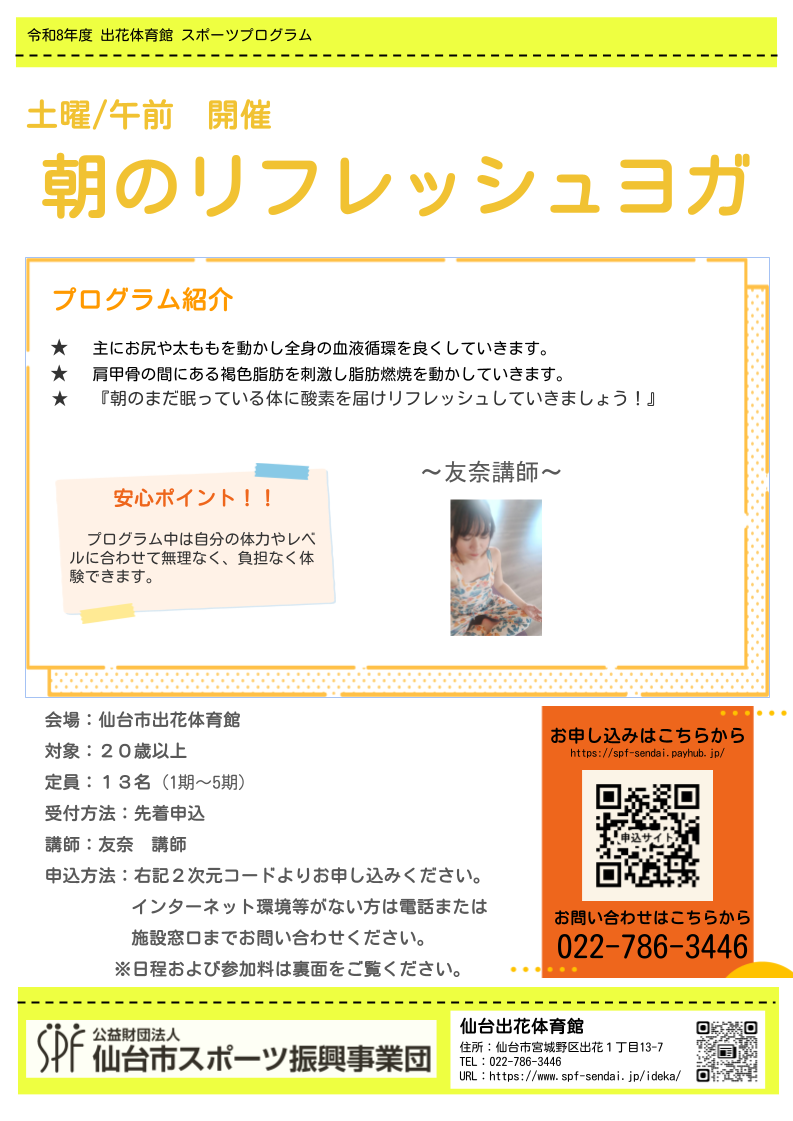 • ・主にお尻や太ももを動かし全身の血液循環を良くしていきます。肩甲骨の間にある褐色脂肪を動かしていきます。朝のまだ眠っている体に酸素を届け『リフレッシュ』していきましょう!。