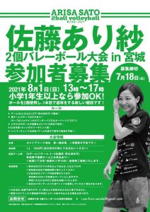 バレーボール日本代表佐藤あり紗さんによる「佐藤あり紗2個バレーボール大会in宮城」を8月1日(日)にカメイアリーナ仙台にて開催します! 佐藤あり紗さんが考案した、ボールを2個使用する新しい競技です! バレーボール未経験者でも簡単にチャレンジできます!ご家族や仲間と参加してみませんか? 詳細はカメイアリーナ仙台のホームページをご覧ください。