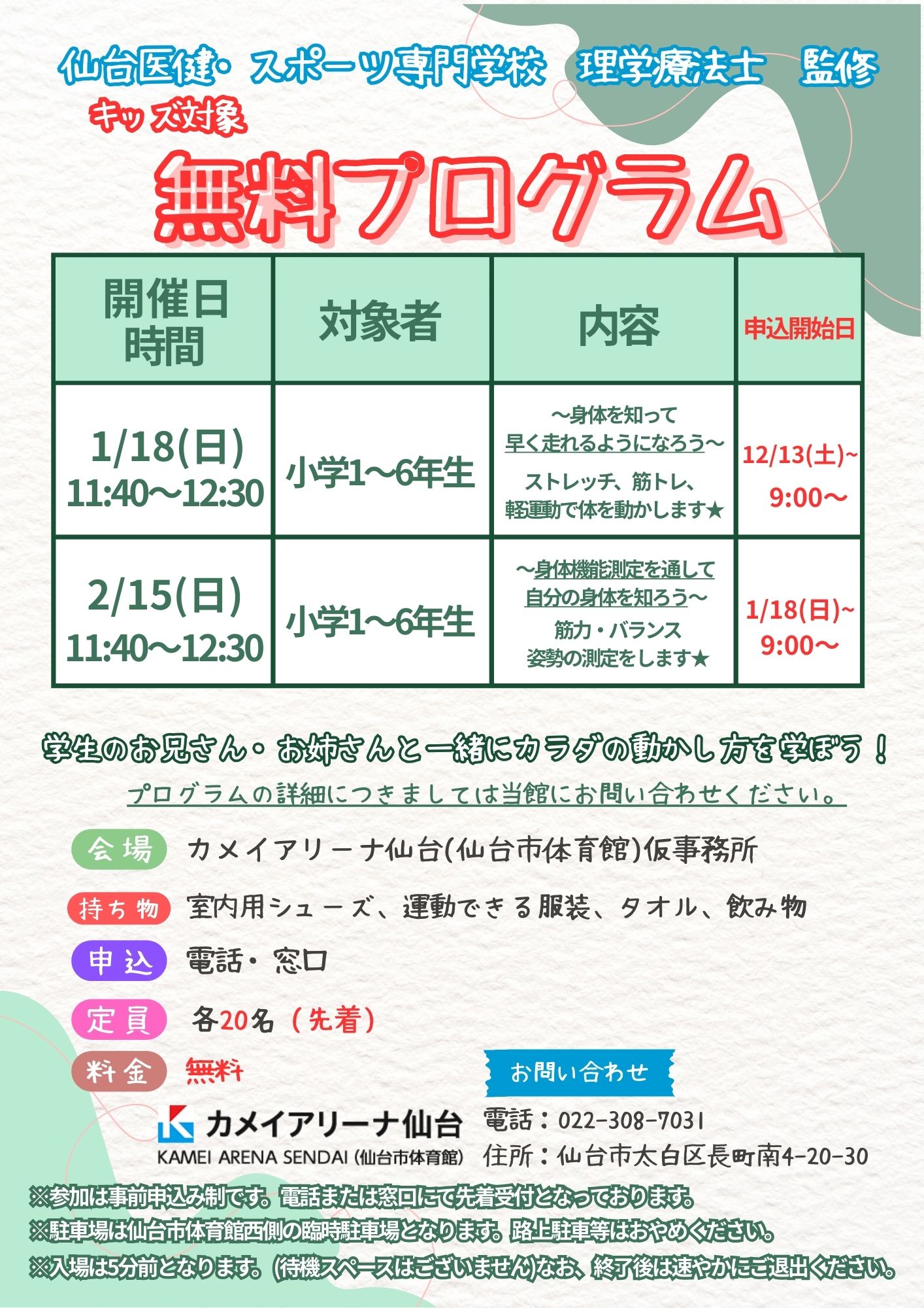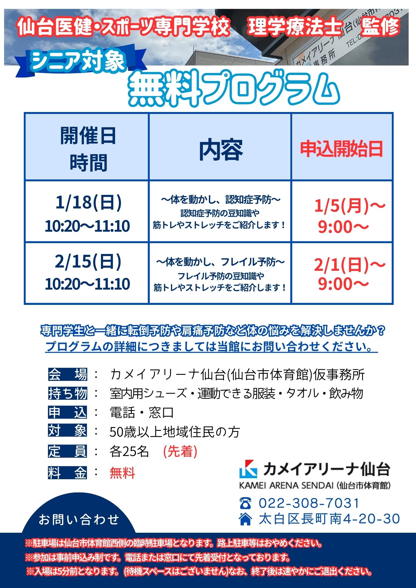 カメイアリーナ仙台は大規模改修工事につき全館休館中(~令和9年3月15日予定)です。 期間中は事務所を移転して、一部プログラムのみご案内しております。
